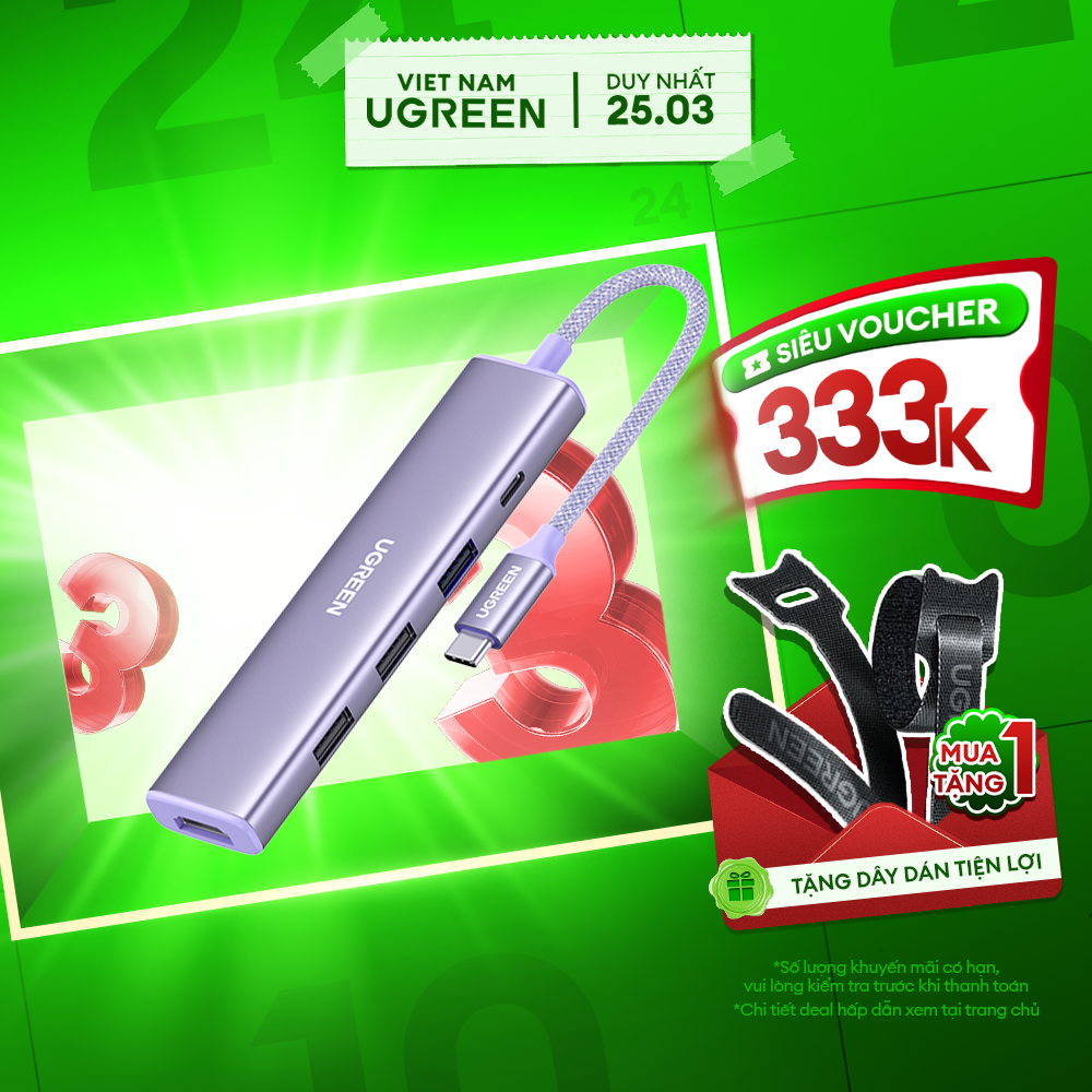 Bộ chuyển đổi USB-C sang 3*USB 3.0+HDMI+USB-C hỗ trợ 4K (35582), màu tím nhạt chuyển đổi âm thanh, hình ảnh và không có chức năng thu phát sóng. Hãng Ugreen mới 100%